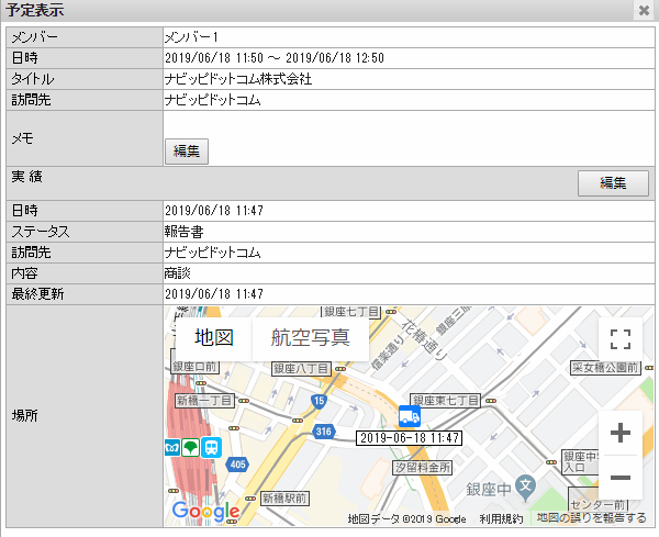 管理PCからだけでなく、メンバーの最新位置(当日送信された最新の位置情報)をアプリ内の地図上で表示することができます。