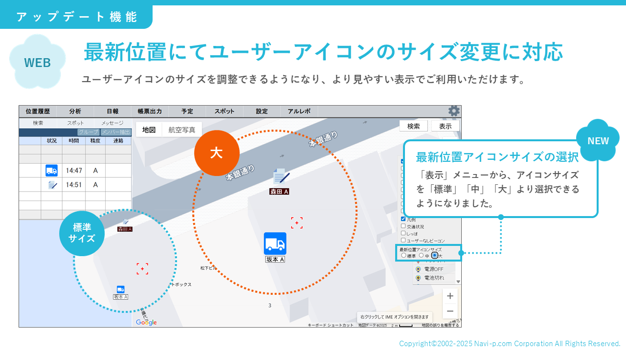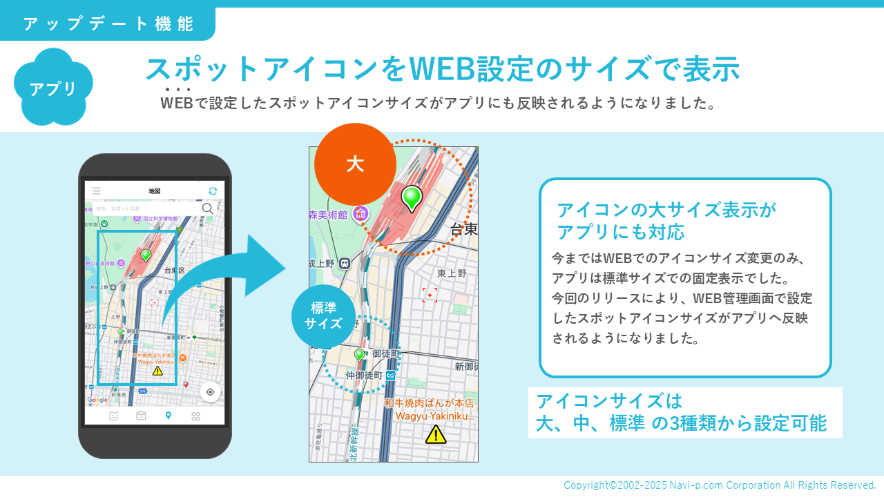 アイコンサイズは「標準」「中」「大」から設定可能となります。→スポットアイコン設定方法