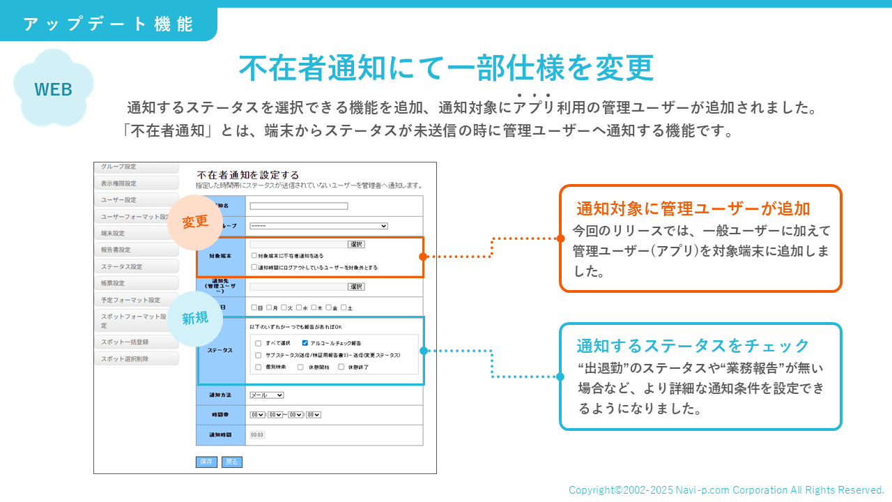 設定条件に「通知対象にアプリ使用の管理ユーザーを追加」と「ステータス選択」を加え、さらに使いやすくなりました。