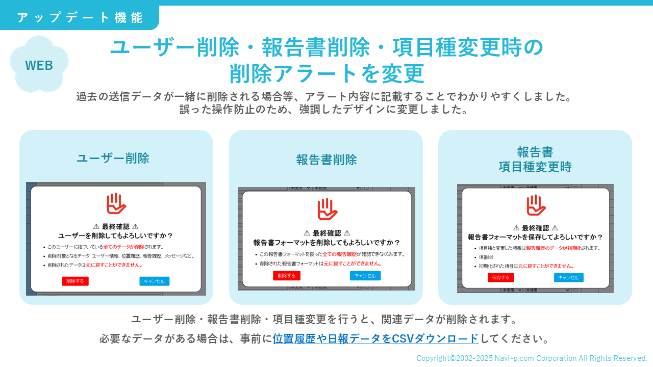 ・ユーザー削除・報告書削除・項目種変更時の削除アラートを変更