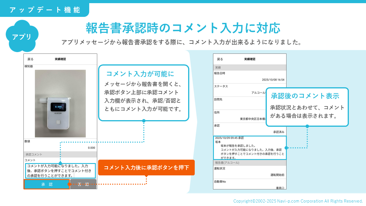 アプリから報告書を承認/否認する際に、コメント入力を出来るようになりました。