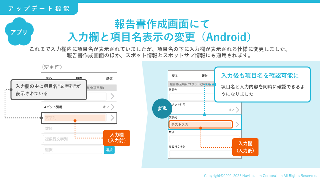 報告書作成画面にて入力欄と項目名表示の変更(Android)