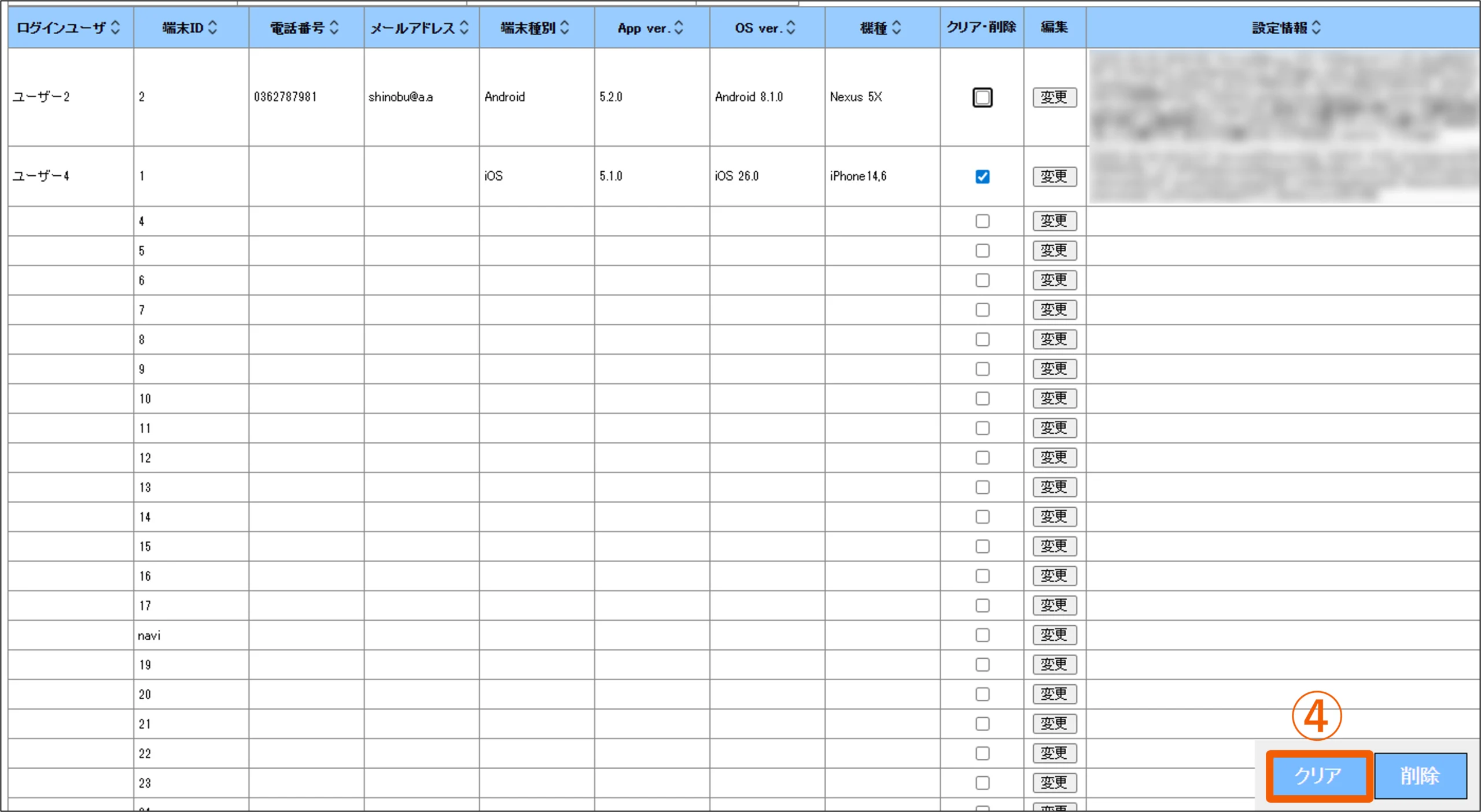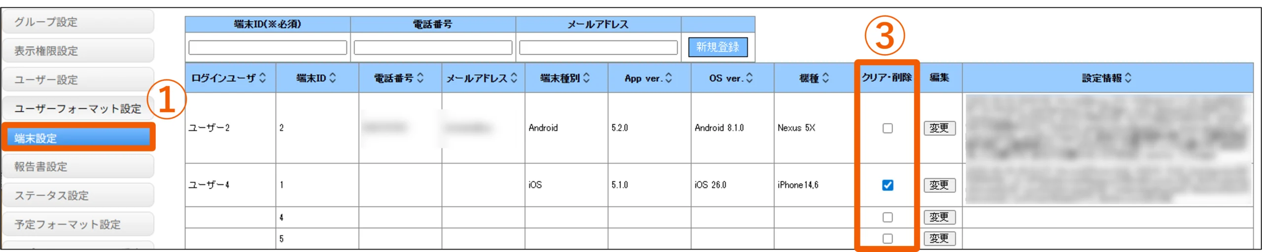 3.端末IDの解除を行う端末が表示されている欄の「クリア・削除」のチェックボックスにチェックを入れます。複数のチェックボックスを選択できるため、複数の端末IDを一括で解除することができます。