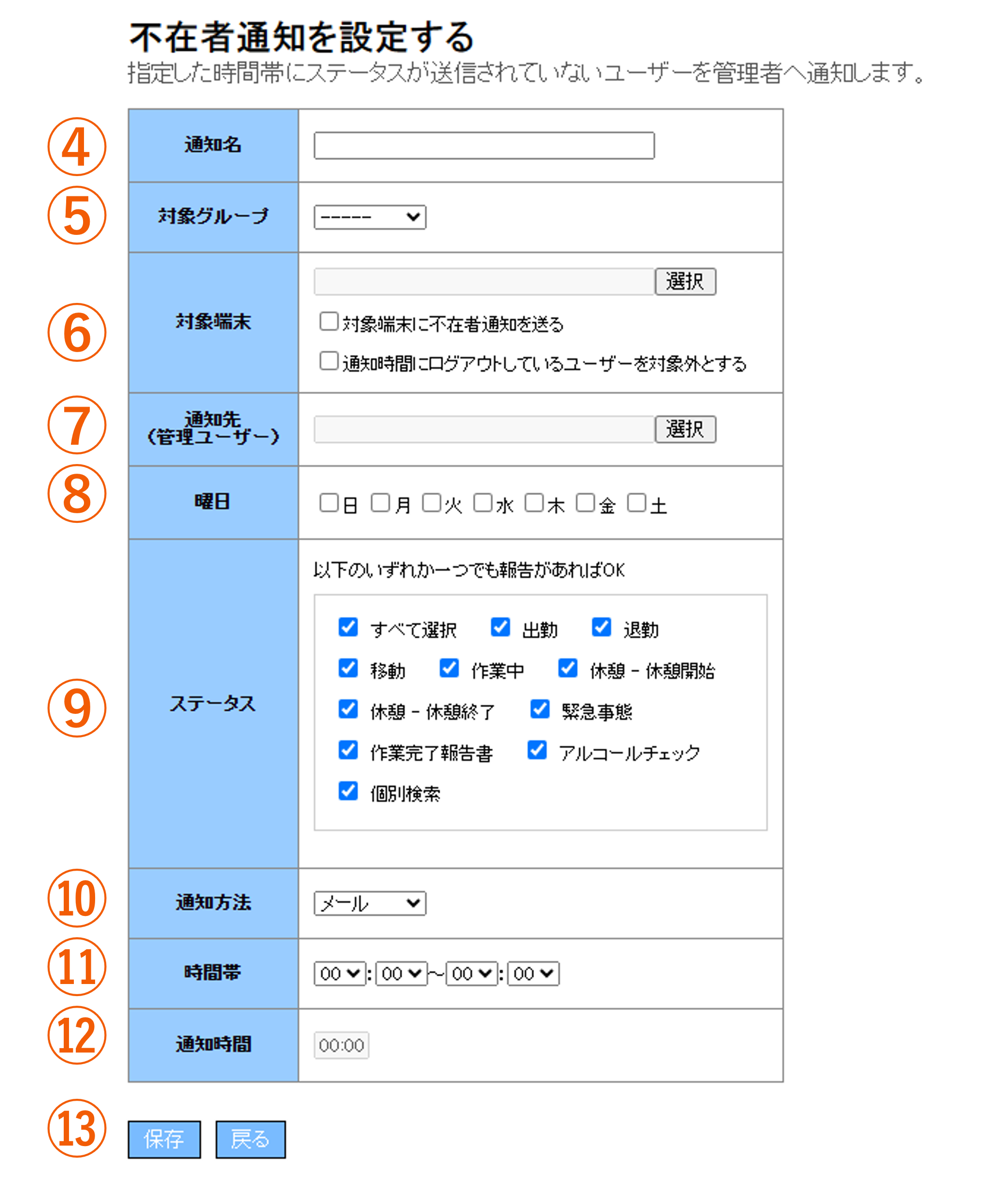 対象端末(位置情報があがっていない端末)に通知を送る場合は「対象端末に不在者通知を送る」にチェックを入れます。