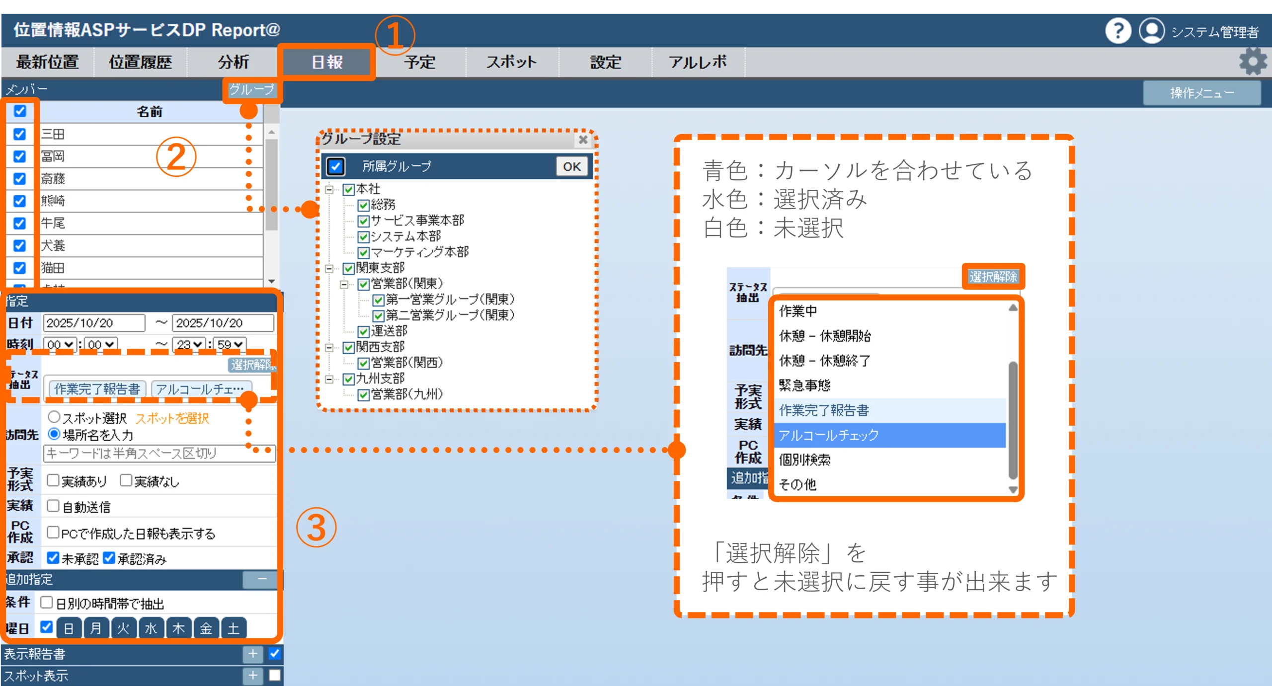 「指定」にて「日付」「時刻」「条件」「曜日」「ステータス抽出」「訪問先」「予実形式」「実績」「PC作成」「承認」を選択します。