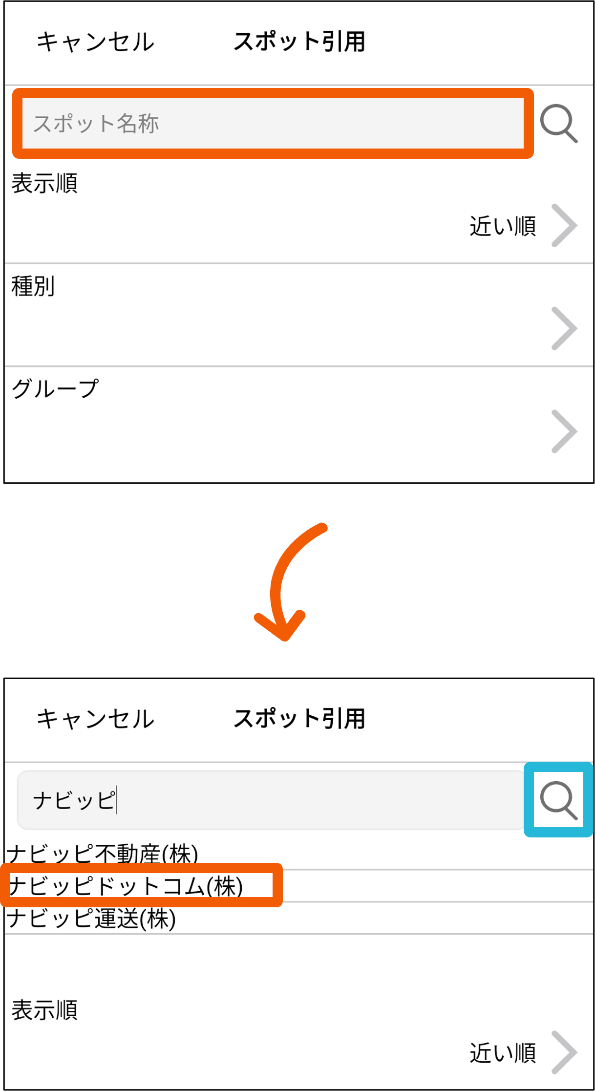 2.「スポット名」欄にスポット名称(一部でも可)を入力すると検索候補が表示されます。