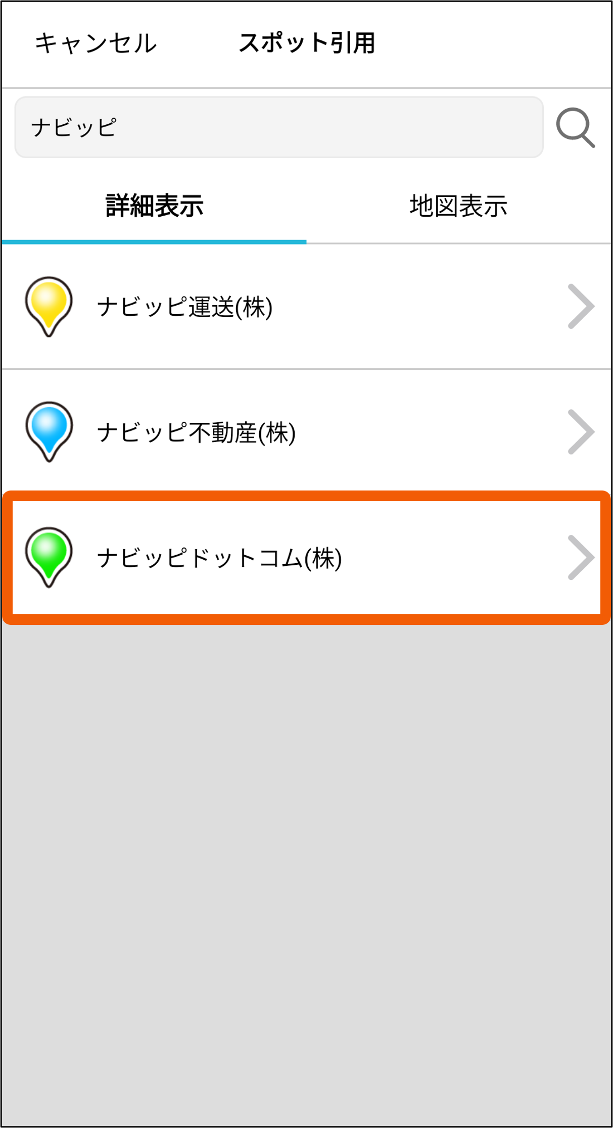 3.虫眼鏡マークを選択すると該当するスポットがリストアップされます。スポットタップで引用されます。