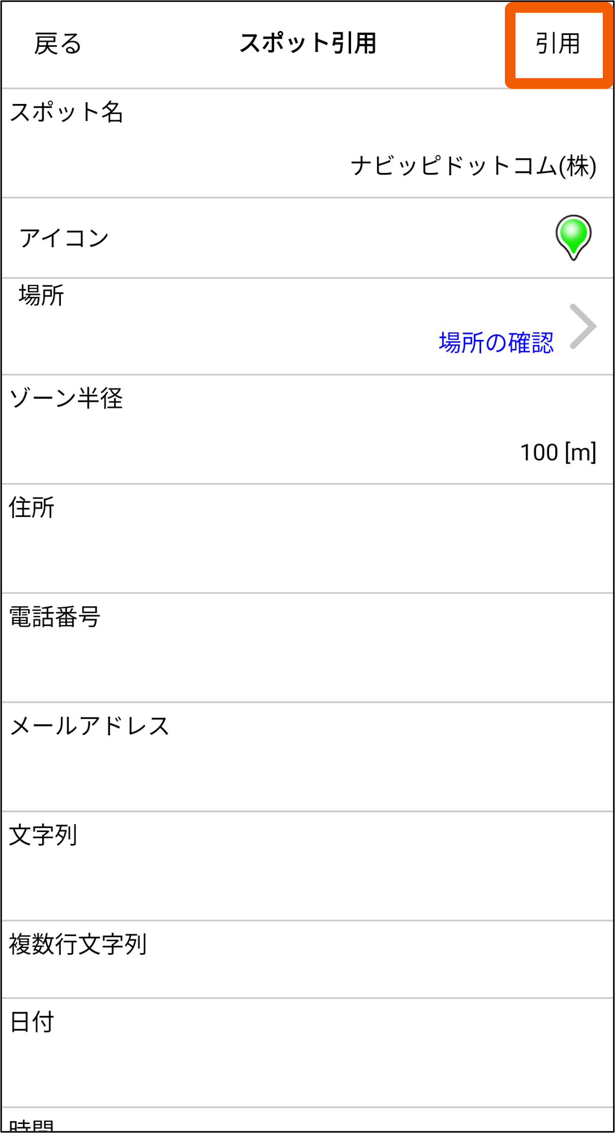 検索候補から引用する場合は、引用したい検索候補を選択後、スポット詳細が表示されたら「引用」を選択します。